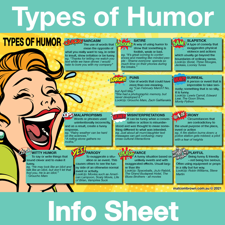 Single A3 Info Sheet outlining the 12 main types of humour, with examples, illustrations and further leads to look up.